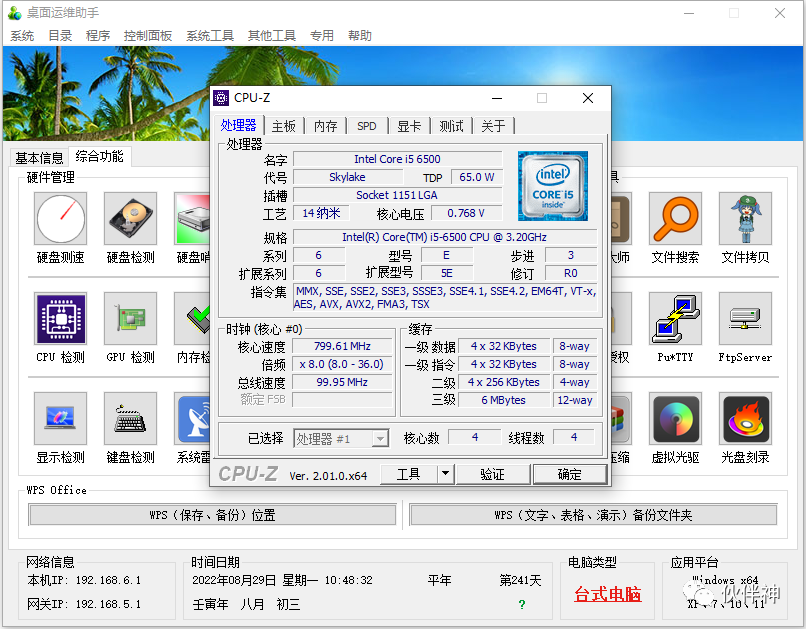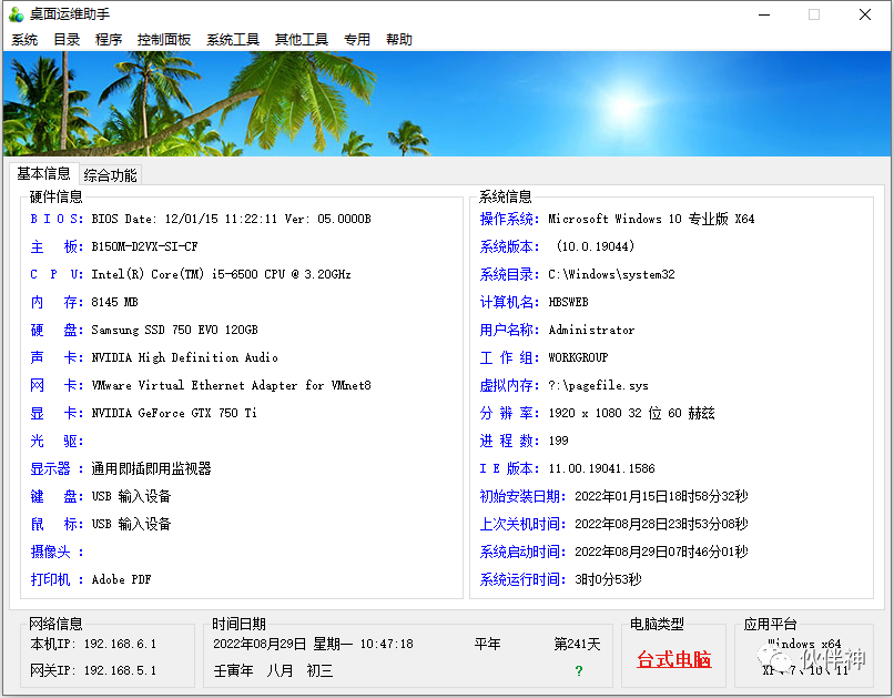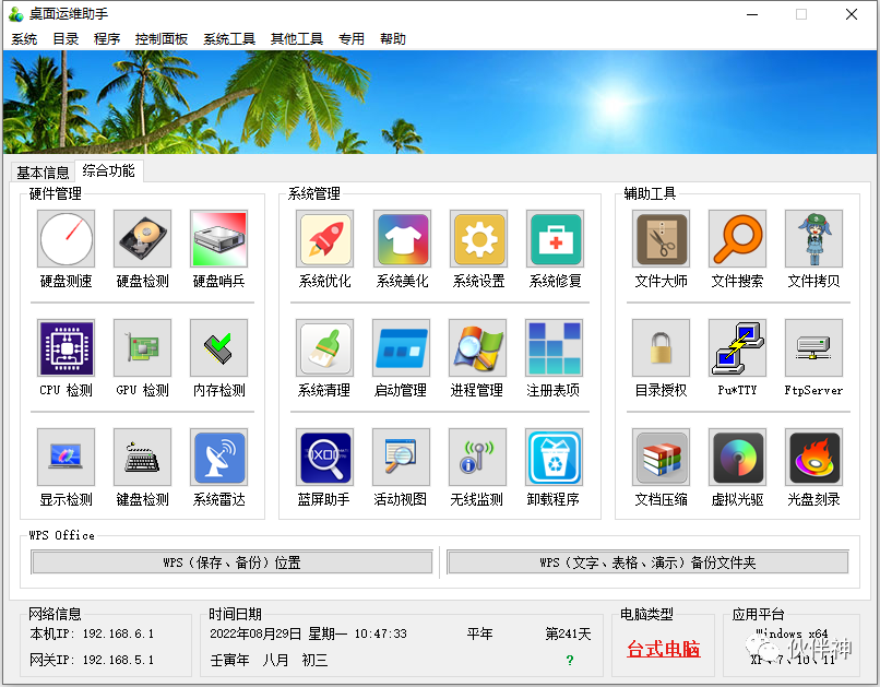 桌面运维助手v20220808是一款集成 Windows 优化、设置、管理的工具。菜单栏包含大部分常用Windows工具,专用中有些其他功能;还可以显示硬件与系统的基本信息,底栏也会有一些网络时间信息等;集成30款第三方实用工具,应有尽有(硬件、系统、辅助等)。