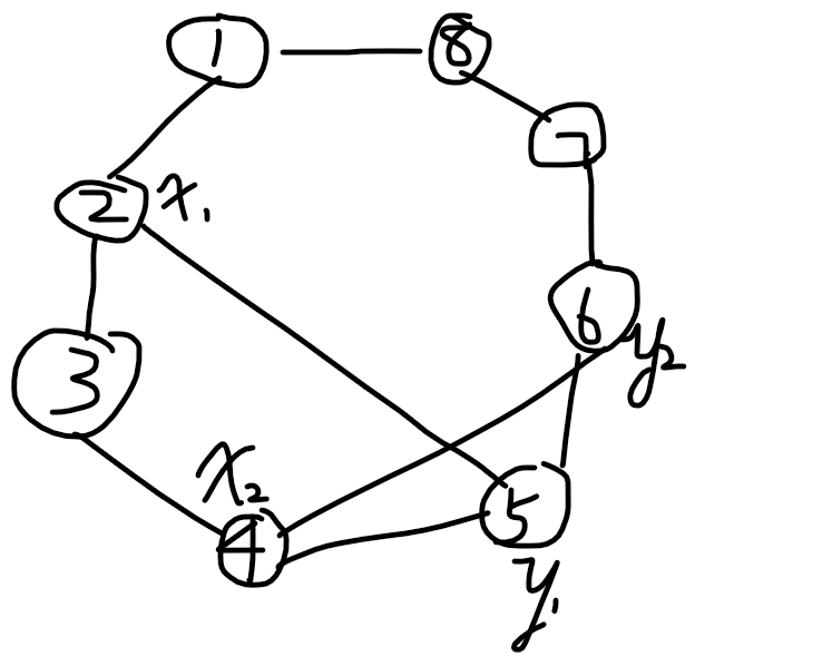 对于一对边,我们珂以通过其在回路上的位置判断是否相交(具体见下面的图和解释)。当然,如果并查集上显示它们在一个集合(即不会相交),那就矛盾了,直接输出NONONO,返回。否则我们就记录一下i,ji,ji,j的相交关系。(合并i,j+mi,j+mi,j+m,合并i+m,ji+m,ji+m,j)。