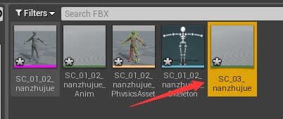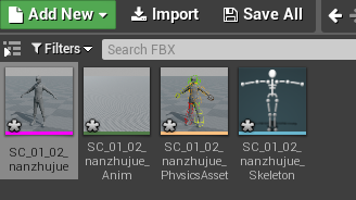看导入后的内容-4个文件Skeletal Mesh 、Animation Squence、PhysicsAsset、Skeleton
