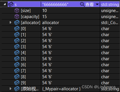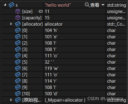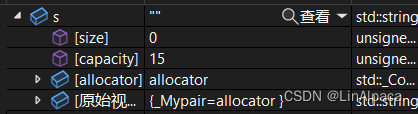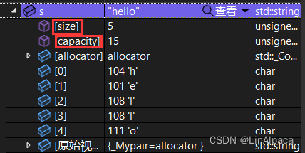 其中 size 就代表当前字符的数量,capacity 则表示当前 string 的容量。类内部也提供了接口供我们访问。