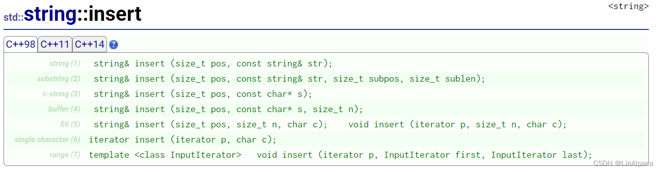 🍿前面三个函数都是在 string 的末尾进行插入,而 insert 可以在 string 的任意位置进行字符、字符串和 string 的插入。