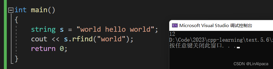 🍿rfind 与 find 相反,rfind 是从 string 的末尾开始找第一个匹配的字符或字符串,并返回其下标。