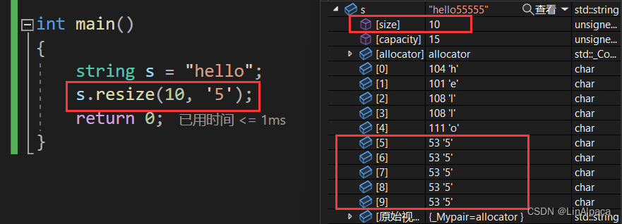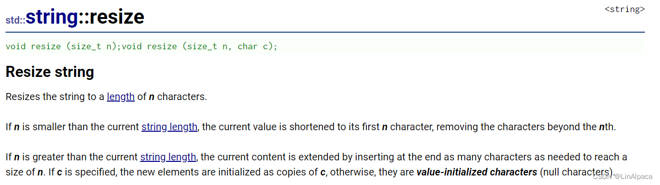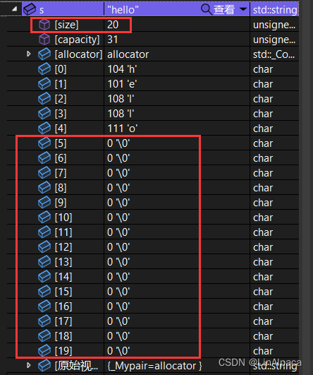 🍿使用 resize 不仅可以更改 capacity 还可以修改 size,扩容时还可以再输入一个 char 作为扩容时初始化的值,否则缺省为 \0。