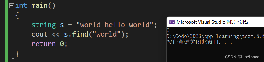 🍿通过find我们可以查找 string 中出现的第一个字符、字符串和 string,找到了就返回匹配的第一个字符的下标,找不到返回 npos。