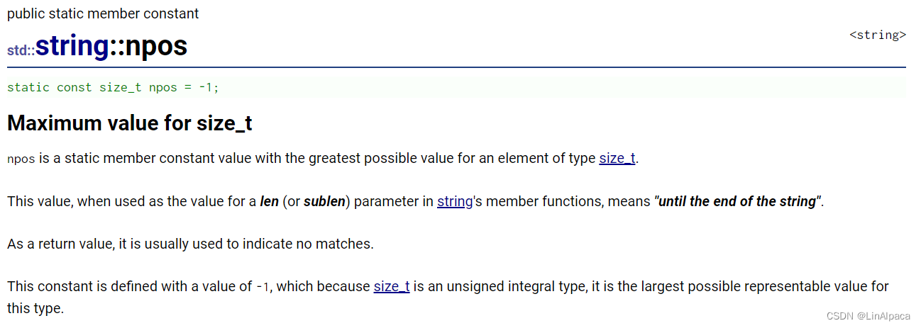 🍿在函数中还提到了一个缺省值为 npos,这个值是 string 类里面自己定义的一个值。虽然上面值写的是 -1 ,但是它的值并不是 -1 ,因为它是一个无符号整数,因此其表示的其实是无符号整数的最大值。