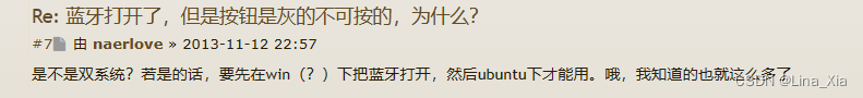 ubuntu蓝牙无法打开 双系统的话,你要跑到windows系统下重新打开!其实我到windows下面发现蓝牙还是开着的,转回来Ubuntu系统就好了,玄学玄学,尽量双系统的话就不要关闭蓝牙吧。Ubuntu无法打开蓝牙有很多帖子,大家纷纷评论效果很好,但我把所有的终端命令安都尝试了一遍,没有用,有的时候右上角出现蓝牙但是灰色而且带有红色❌。