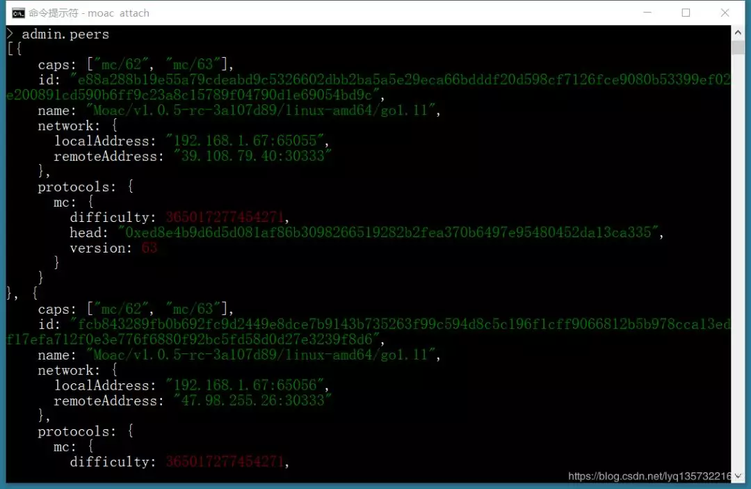 启动节点的时候需要打开rpcapi包含“admin”;进入moac attach界面,可以查看邻接点信息: