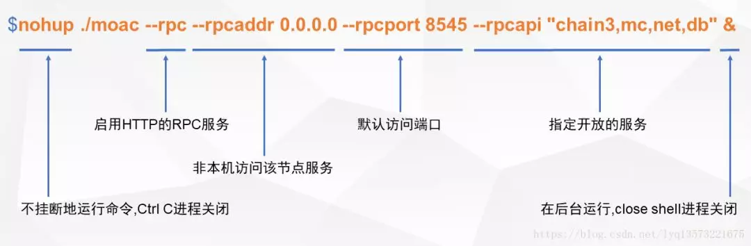 nohup ./moac --rpc --rpcaddr=0.0.0.0 --rpcport=8545 --rpcapi="chain3,mc,net,db,personal,debug,vnode,scs" &