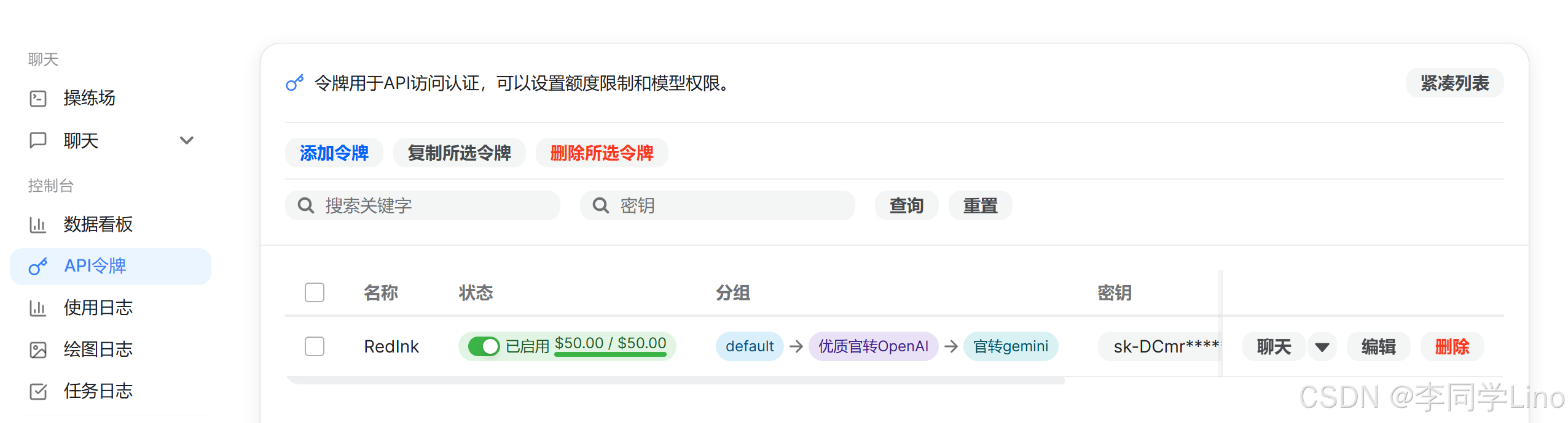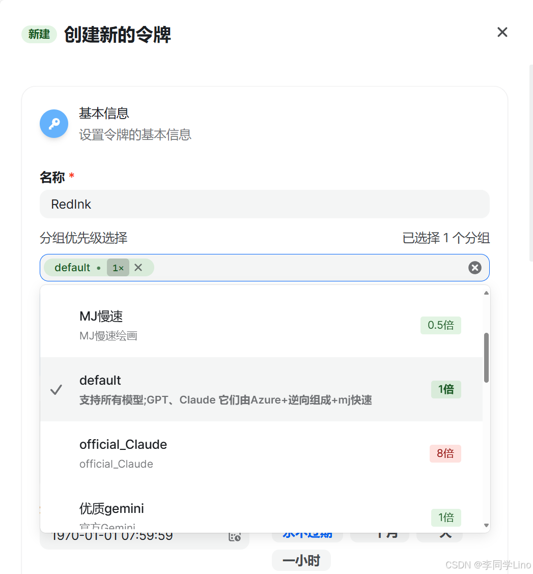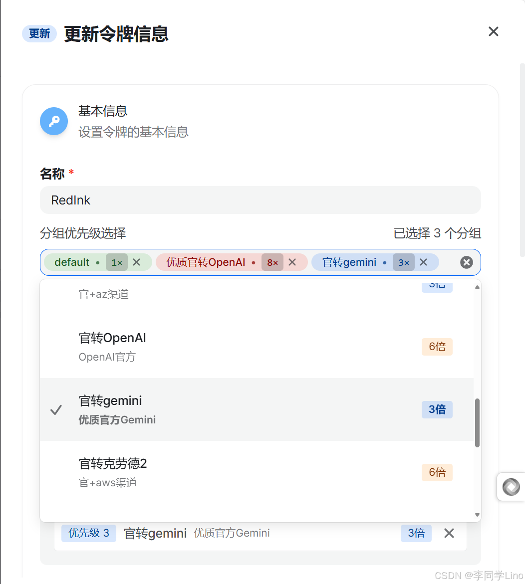 创建令牌时,“名称”可以随意填写,例如我填写的是 RedInk 。 “分组”建议选择 default,最好把 优质官转OpenAI和官转gemini加上,提高稳定性,接着我们会在 RedInk 的配置文件中填写模型名称,中转平台会根据模型自动路由到正确的接口。
