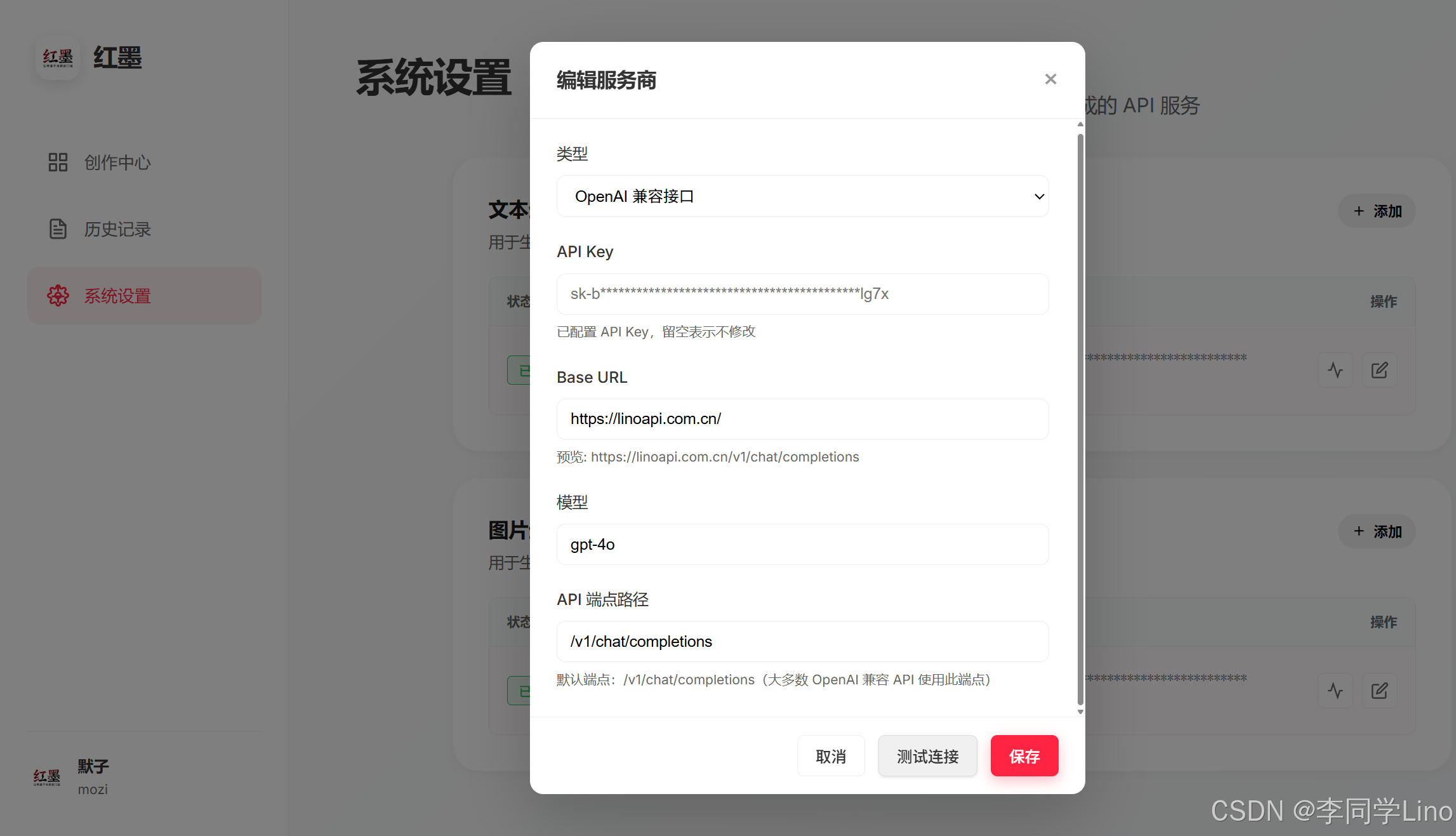这里以OpenAI作为文本生成配置,在右边的编辑按钮,需要编辑服务商,类型选择 OpenAI 兼容接口 ,ModelID填写 gpt-4o ,API Key 就复制你刚生成的 Key 。Base URL 填写https://linoapi.com.cn/,配置好之后需要测试连接,连接成功之后就可以保存啦。