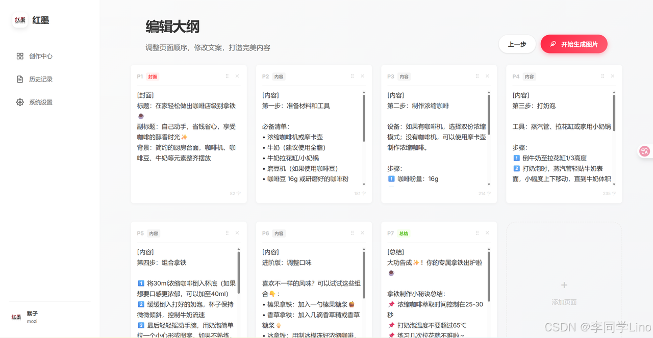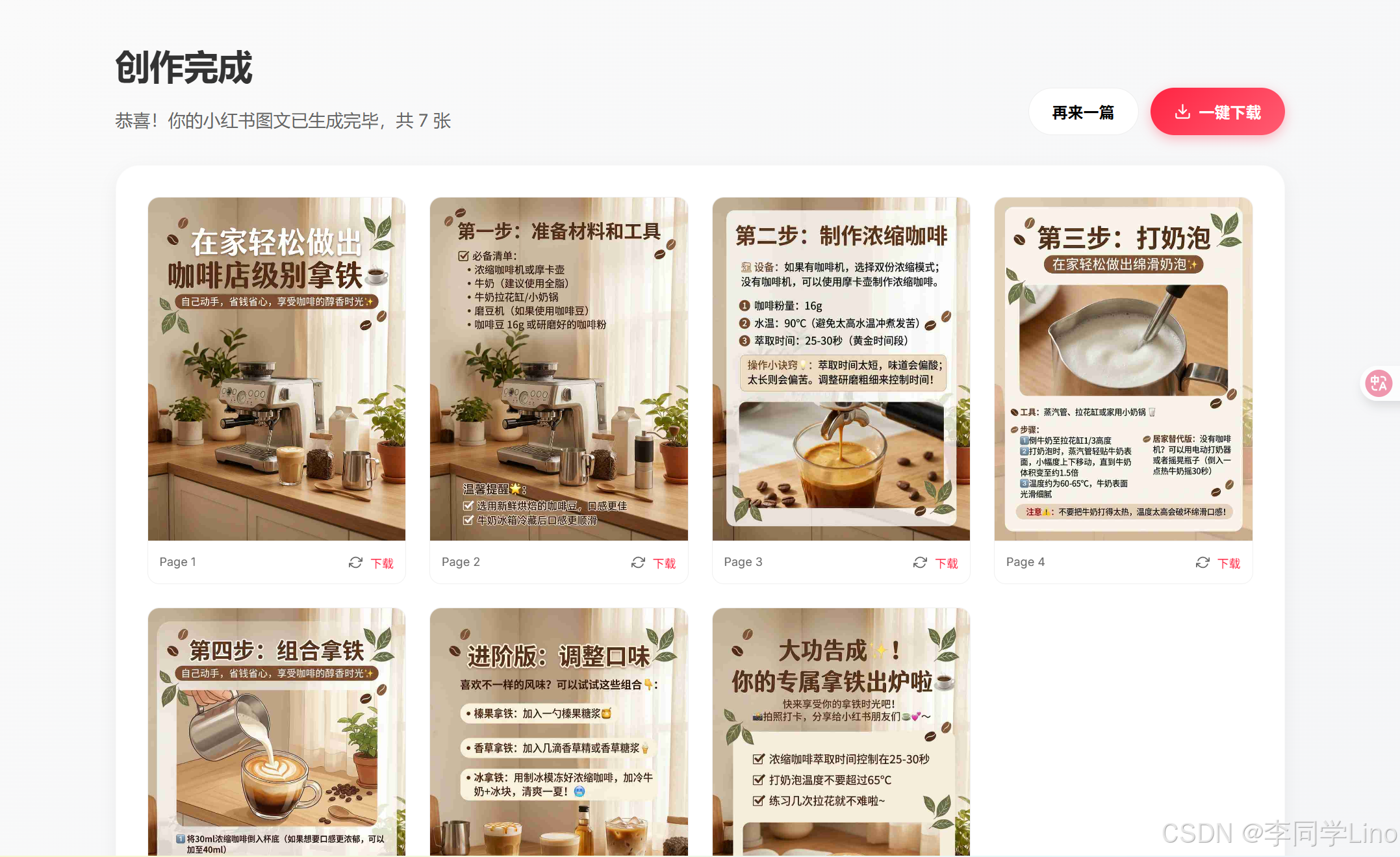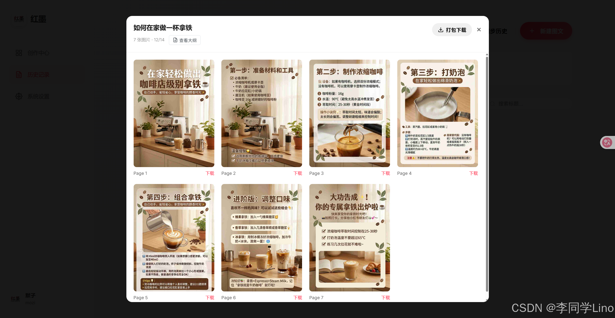 点击生成,观察流程:1.自动生成页面大纲 2.可手动编辑每一页内容(强烈建议) 3.生成封面 4.后续页面并发生成 5.最终可一键下载全部图片