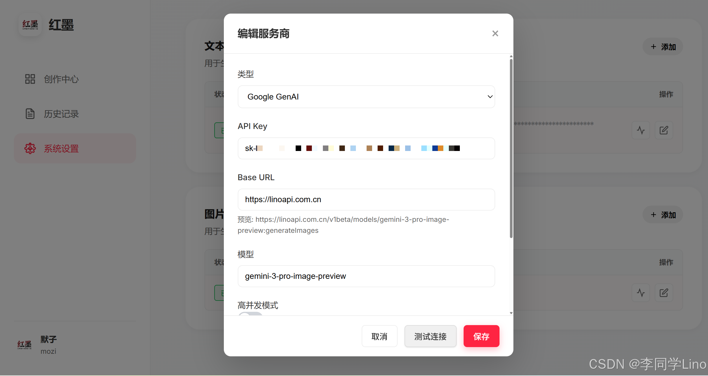 这里以Gemini作为图片生成配置,在右边的编辑按钮,需要编辑服务商,类型选择 Google GenAI ,ModelID填写 gemini-3-pro-image-preview ,API Key 就复制你刚生成的 Key 。Base URL 填写https://linoapi.com.cn,配置好之后需要测试连接,连接成功之后就可以保存啦。