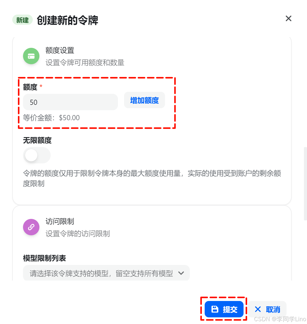 你还可以为这个令牌设置额度限制,例如设置 50 元 作为上限,确保 RedInk 的调用不会意外消耗过多费用。如果你希望不限额度,也可以选择无限制。但无论哪种方式,请记得在 「钱包」 中充值,否则 API 将无法调用。