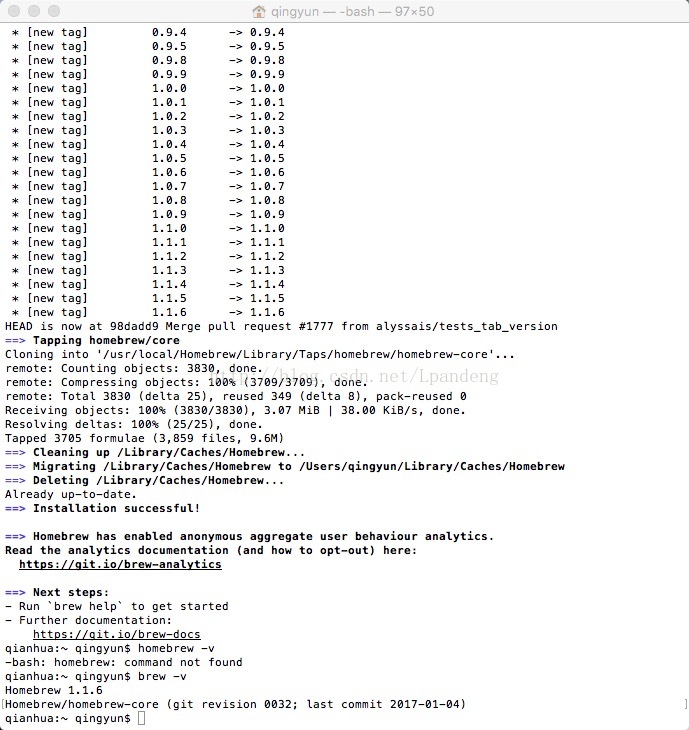 指令: /usr/bin/ruby -e "$(curl -fsSL https://raw.githubusercontent.com/Homebrew/install/master/install)"