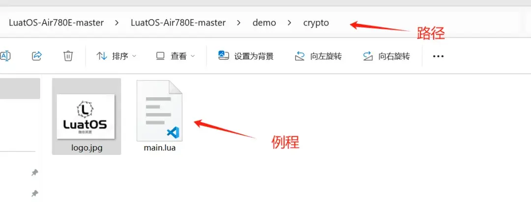 下载的文件解压,找到 LuatOS-Air780E-master\demo\crypto\main.lua,如图: