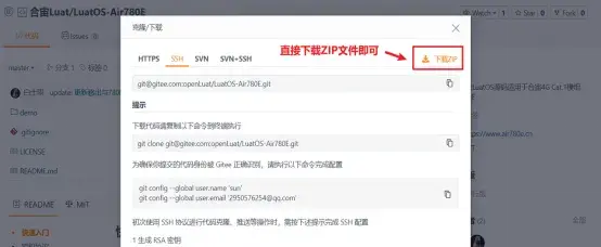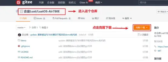 首先要下载 Air780 的 LuatOS 示例代码到一个合适的项目目录,示例代码网站: https://gitee.com/openLuat/LuatOS-Air780E