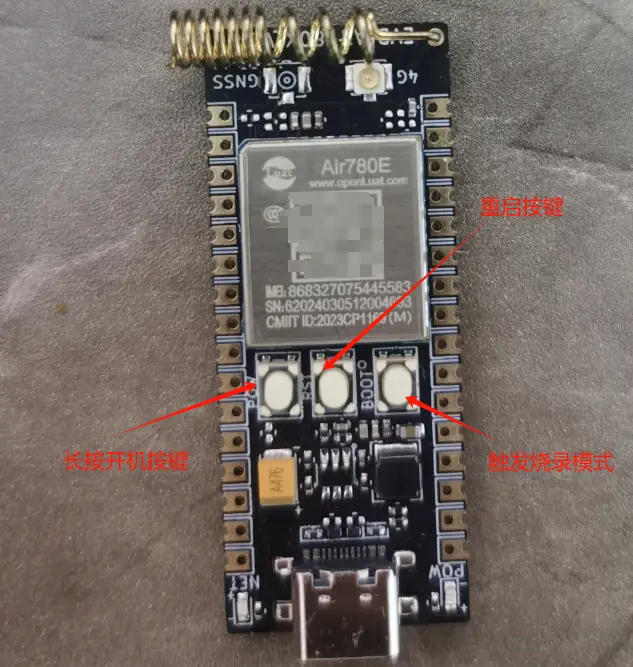 2、当我们模块开机时,按着 BOOT 键然后点按重启键即可.