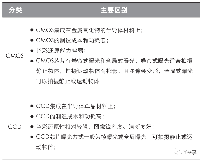 CMOS相机:使用CMOS感光芯片为图像传感器的相机 ,将光敏元阵列、图像信号放大器、信号读取电路、模数转换电路、图像信号处理器及控制器集成在一块芯片上,还具有局部像素的编程随机访问的优点。