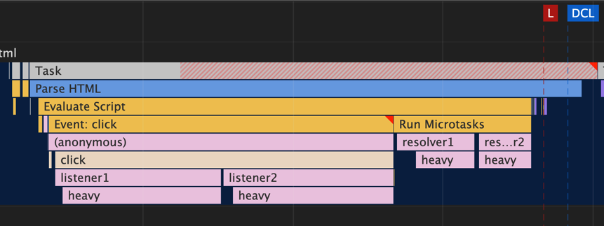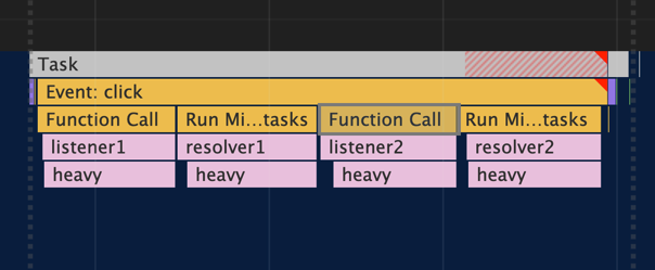 从上图中我们可以看到,一次点击事件之后,浏览器会调用 Function Call 进入JS引擎,执行 listener1,输出