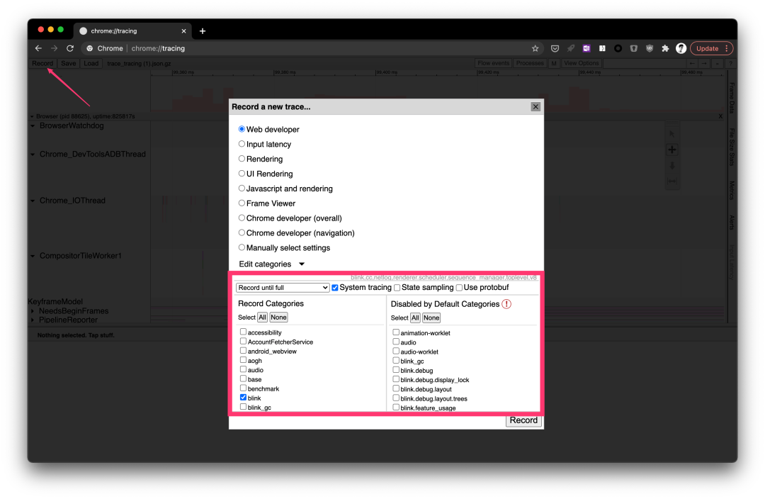 使用方法如下,首先进入 chrome://tracing 点击右上角的 Record,勾选住你想 profile 的组件。