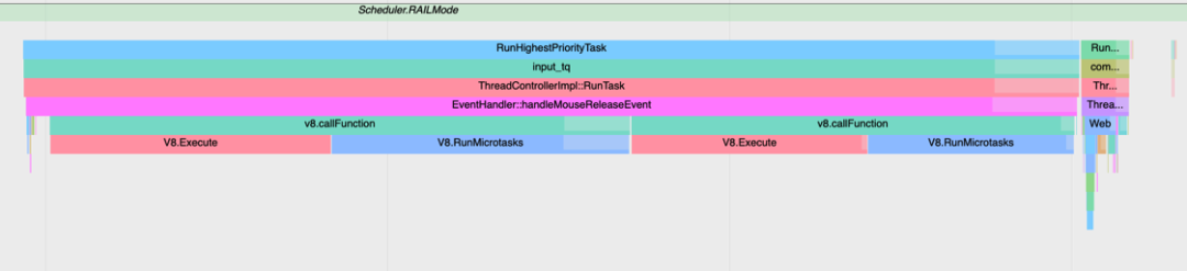 从上图中我们可以看到,一次点击事件之后,Blink(Blink是一个渲染引擎,Chrome 的 Renderer 进程中的主线程大部分时间会在 Blink 和 V8 两者切换)会调用 v8.callFunction 进入 V8 引擎,执行 listener1,输出