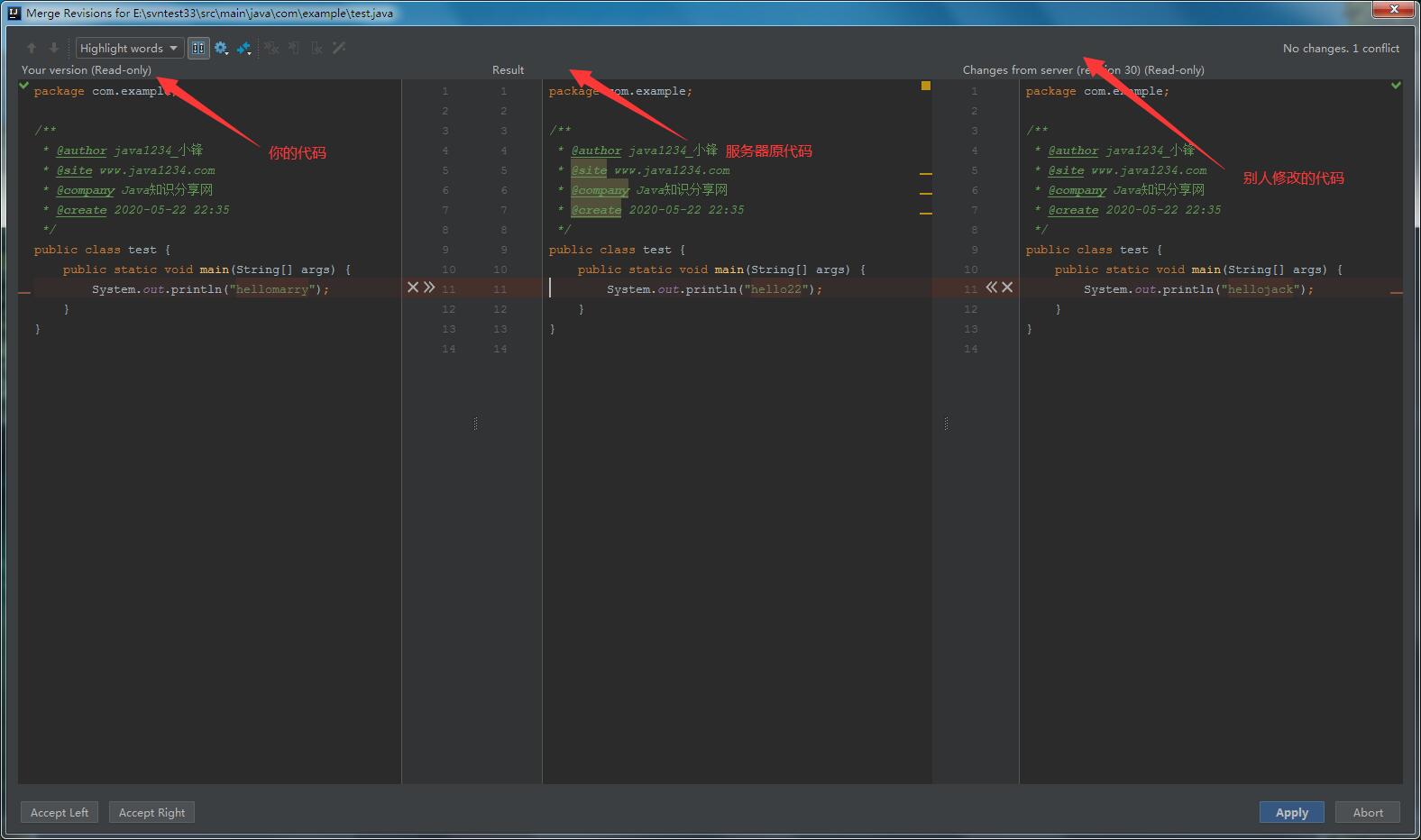 说明:参考了多篇文献,总结得出最便捷的解决办法,其中部分图片是借用了博主(idea svn代码文件内容冲突解决_Java开源博客系统-Powered by java1234)了,如有冒犯,请联系删除!