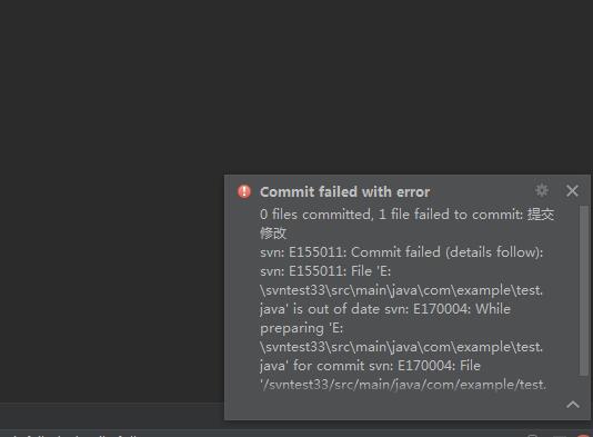 提示代码冲突如下,会看到弹窗出现冲突的代码文件,如果没有看到,可以选择“VCS -> Subversion -> update File ...”(更新svn代码)