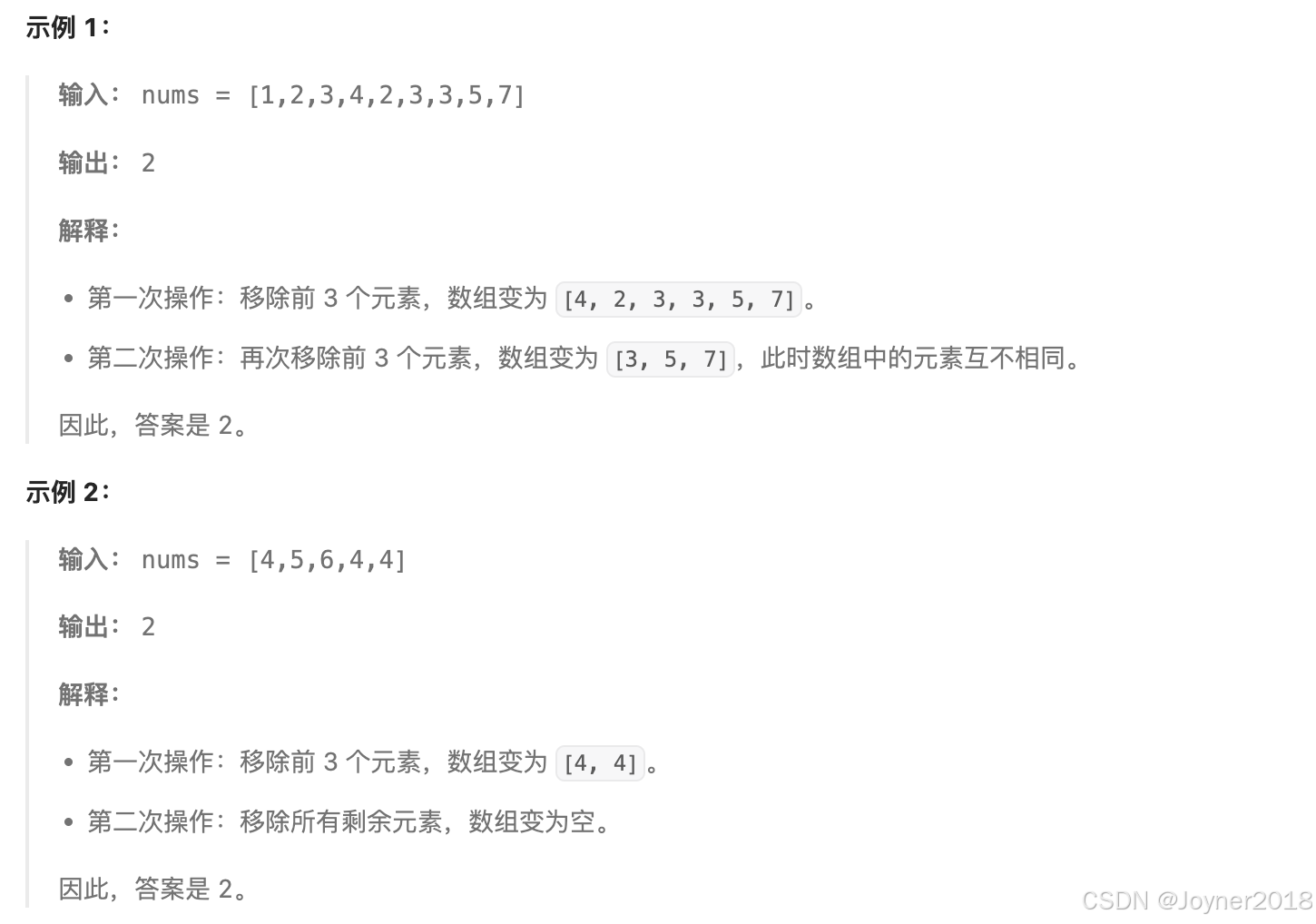 nums,检查当前元素是否已经在seen中:- 如果存在重复元素,就必须执行一次移除操作,即从开头移除 3 个元素。