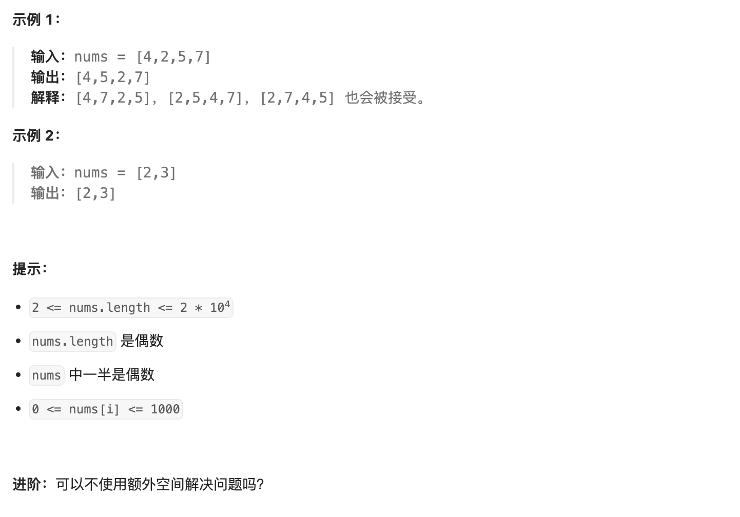 print(sortArrayByParityII(nums)) # 示例输出:[4, 5, 2, 7]