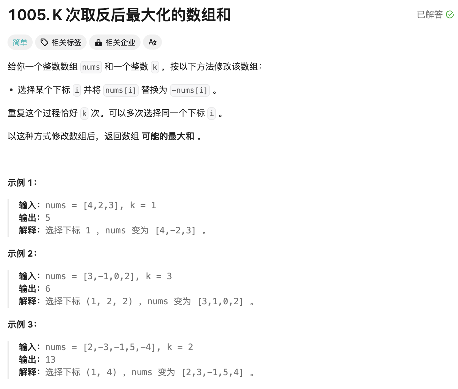 1005. K 次取反后最大化的数组和 - 力扣(LeetCode)