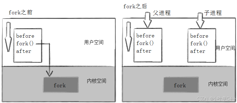 【Linux】进程控制 在 linux 中 fork 函数是非常重要的函数,它从已存在进程中创建一个新进程。新进程为子进程,而原进程为父进程。返回值:子进程返回0,父进程返回子进程 id,出错返回-1。fork 之前,只有一个进程在运行。用户空间是指用户应用程序运行的区域,内核空间是操作系统核心部分运行的区域。fork 之后,系统创建了一个新的子进程。fork 之前,父进程在用户空间中运行。父进程调用 fork() 后进入内核空间。fork 之后,就有两个二进制代码相同的进程。而且它们都运行到相同的地方。