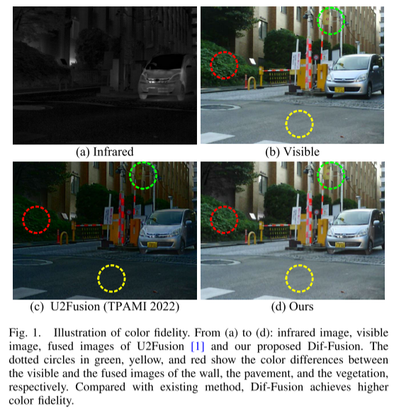 现有的方法大多集中于融合可见光图像中的纹理/梯度和红外图像中的强度,而没有关注色彩信息的保留以及多通道互补信息的提取。所提出的方法基于扩散模型建立多通道输入数据的分布,并提取多通道互补信息,以实现高色彩保真度。如图1(d)所示,我们的融合图像具有高色彩保真度,更适合人类视觉感知。在融合结果评估方面,除了现有的量化强度和梯度保真度的指标外,我们还引入了一个用于量化色彩保真度的指标。通过所提出的Dif-Fusion,红外与可见光图像可以直接输入模型,而无需进行色彩空间转换。总结起来,本文的主要贡献有三点: