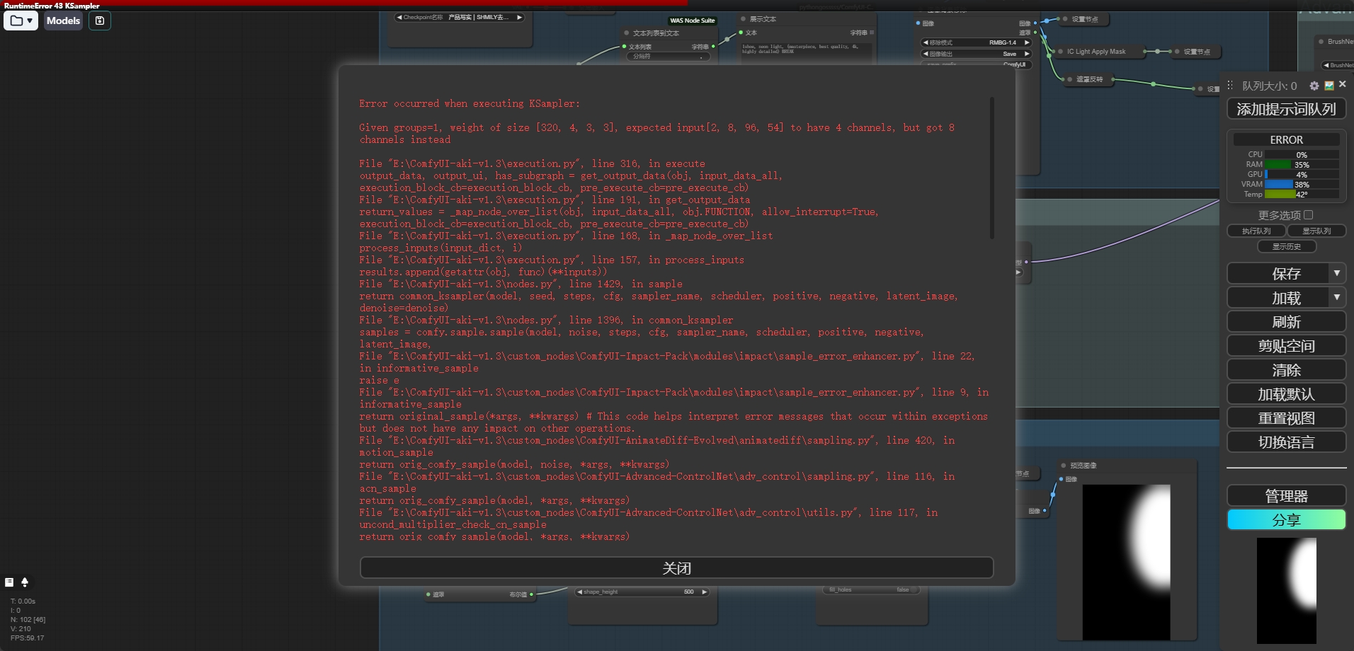 comfyui中的k采样器报错Given groups=1, weight of size [320, 4, 3, 3], expected input[2, 8, 96, 54] to have 4 求助大佬!!!我运行comfyui的时候,k采样器变紫,同时报错显示: