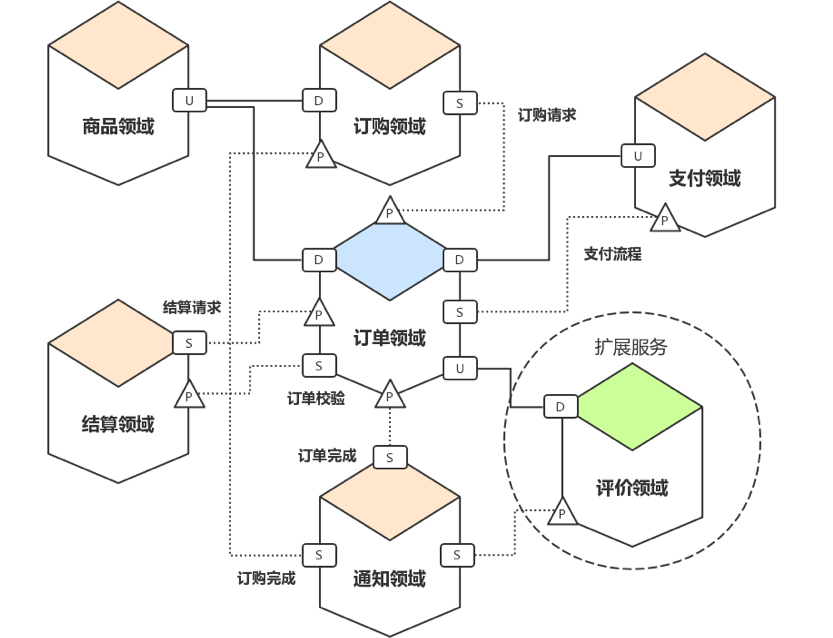采用领域驱动设计的六边形架构绘制了一张交易系统的领域边界图,不同颜色表明不同领域,U/D 代表上游和下游。这个图还不算完整,因为领域业务逻辑是要为端服务的,而通过对领域的梳理,可以通用的支持很多端。即表达为领域有界,端无界。最终,每个限界上下文即是微服务。
