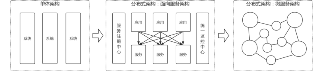 微服务架构几乎都是从 ALL IN ONE 的单体架构演进而来,中间又经历了分布式架构、面向服务架构的演进过程。