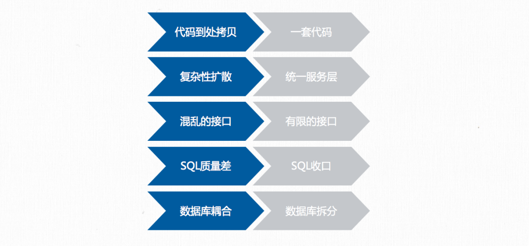 微服务化拆分必然会在初期产生代码到处拷贝,没有一套代码,必然会造成复杂的扩散,如同样语意的 A、B 两个接口,如果 A 接口存在性能问题需要加缓存,那么 B 接口也会存在同样的问题,并需要同样的改造,这样复杂度就会到处蔓延,同时也无法实现统一的服务层架构,还有,如果同样语意或相似语意的接口太多,那么接口就是混乱的,无法实现有限接口的治理,如果系统出了问题,可能很难定位问题。业务逻辑是依赖于数据的,如果接口是混乱的,那么慢 SQL 等质量差的 SQL 就无法进行有效收口改造,同样就更加难以实现数据库拆分和解耦。综上,服务治理的过程就是从无序到有序的过程。