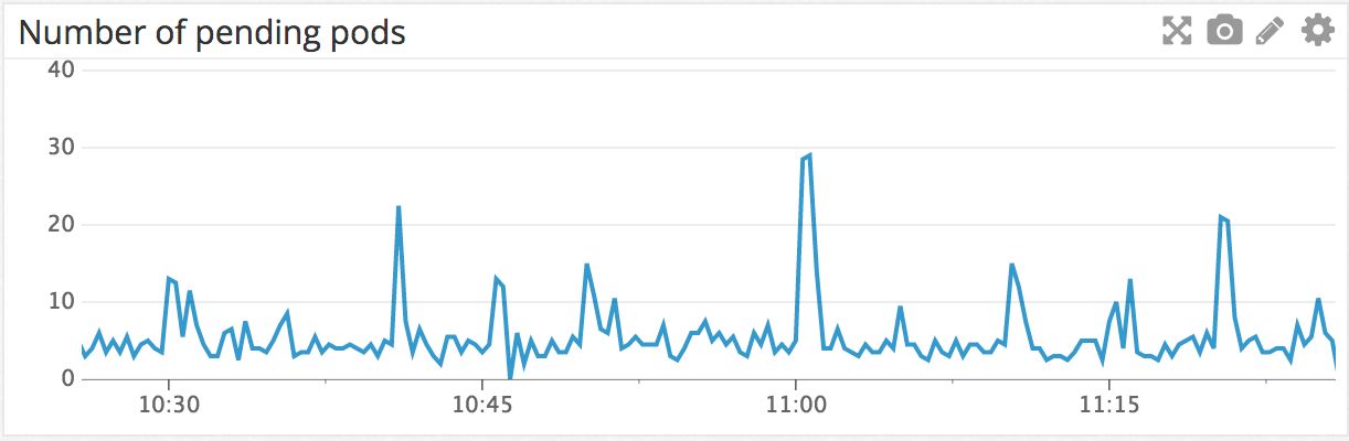 例如,下图是集群中上一个小时挂起的Pods示意图。挂起意味着等待被调度到某个工作节点上运行。可以看到在11am时有个峰值,因为很多cron作业都是在这个时间运行的。