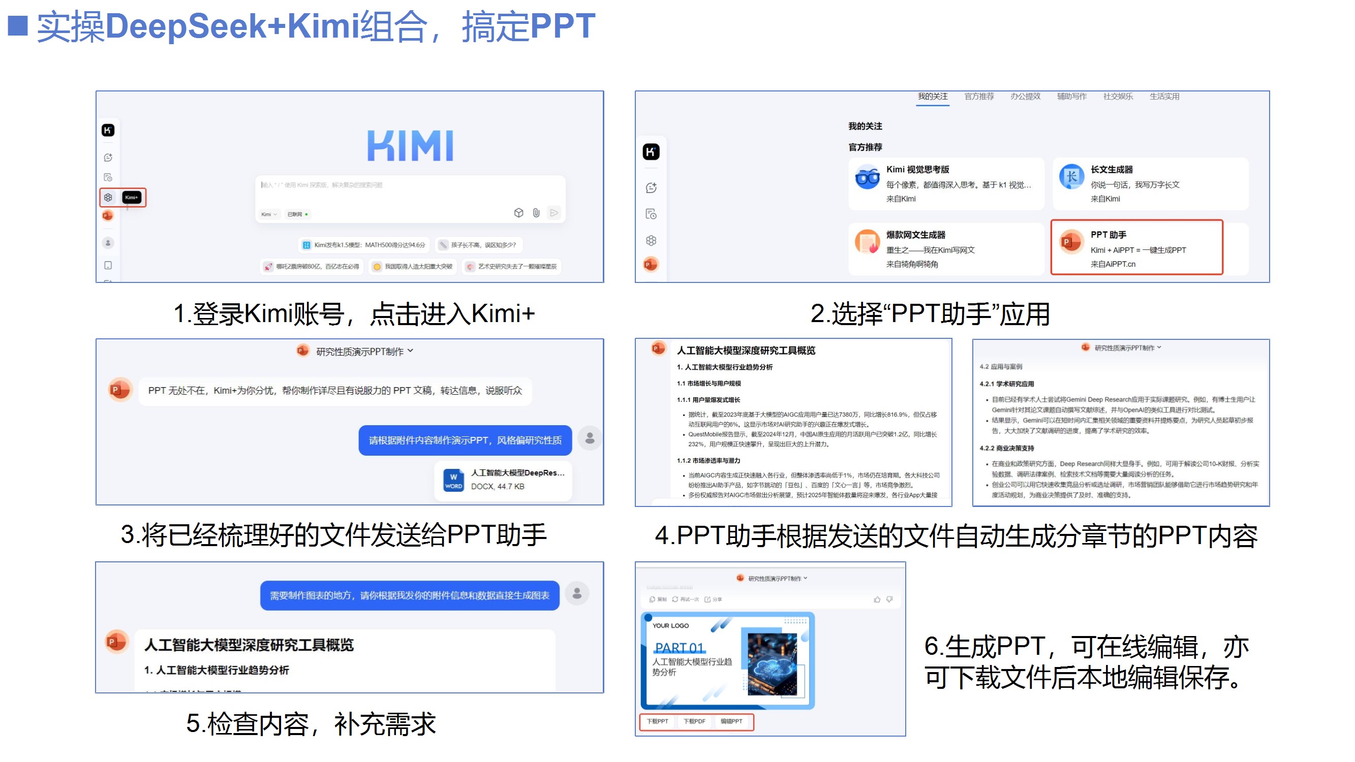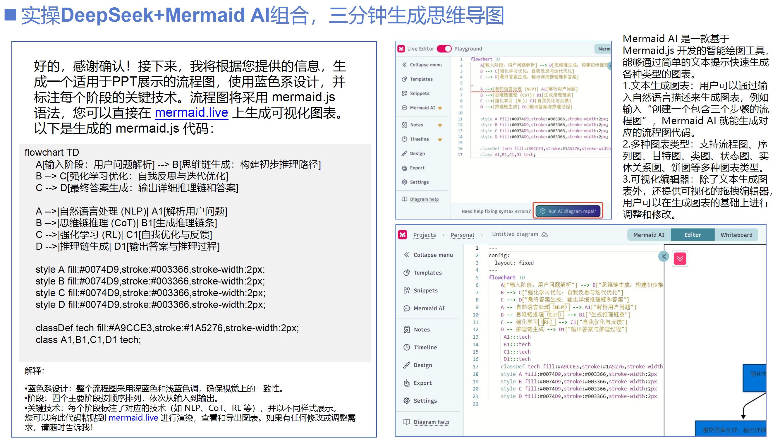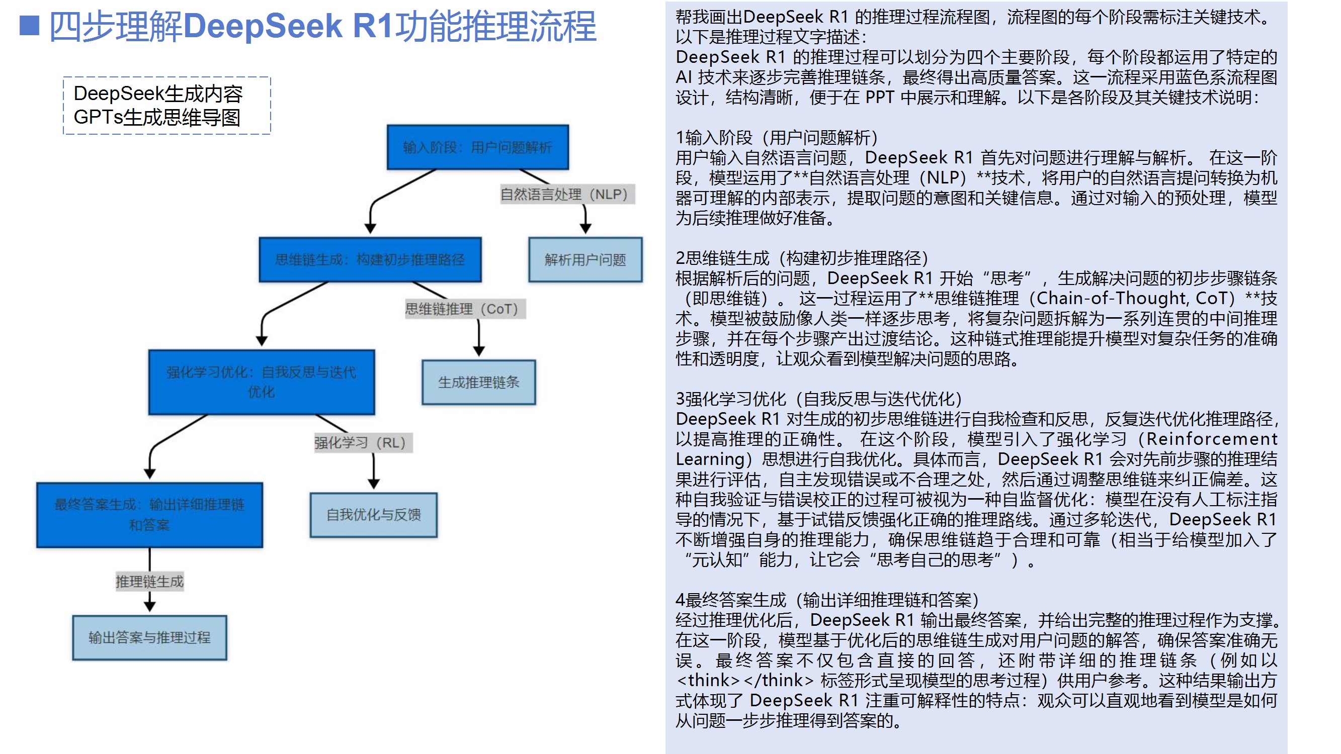 总结推理大模型的实践经验和注意事项。建议根据任务需求选择模型(明确任务用推理模型,模糊任务用通用模型),结合两者优势(如模板类任务);提示词设计需简洁,避免过度干预;需警惕幻觉问题,结果需人工校验。列举工具组合(如DeepSeek+Mermaid AI生成流程图、Kimi+DeepSeek制作PPT)和行业案例(如医疗诊断、政策分析),强调AI内化需持续实验与迭代。