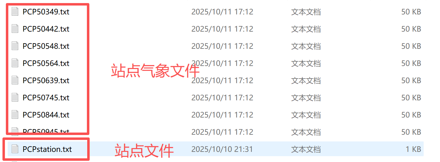 制备站点气象数据先从原始气象数据excel中整理出来按站点分类的气象数据的几个excel,每个excel是一个站点里对应原始气象数据的各列指标,然后用代码读取这些excel批量一次性生成这些气象数据文件(.txt),最后复制粘贴到五个文件夹(PCP、TMP、SLR、HWD、WND)中
