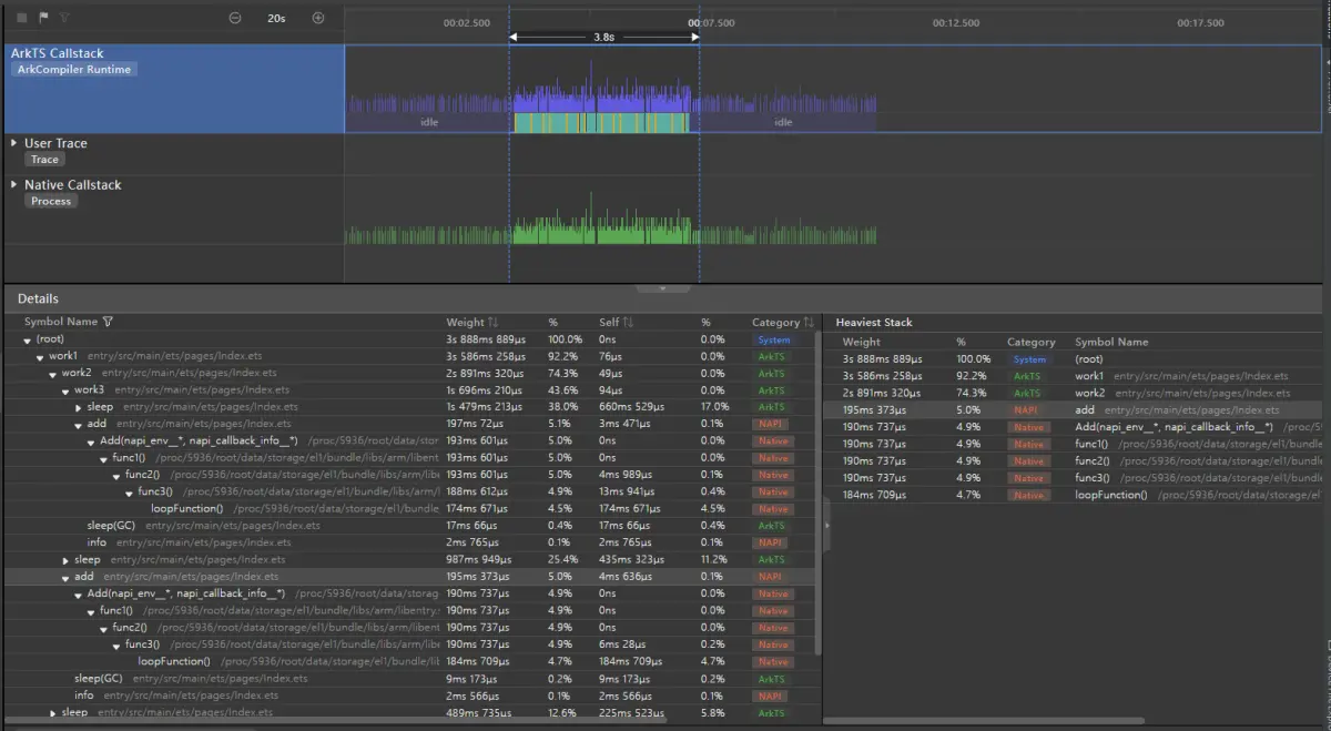开发者可通过该工具查看TS/JS代码及NAPI代码执行过程中的时序及耗时情况,进而发现热点函数及性能瓶颈,进行应用层性能优化。