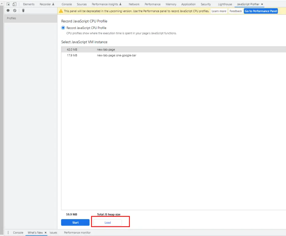 在 Chrome 浏览器上打开JavaScript Profiler工具并加载数据文件的操作步骤为:F12 > More tools > JavaScript Profiler > Load。