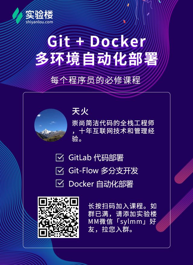 关注「实验楼」,每天分享一个项目教程 代码托管和开发环境部署是每个程序员的必修课,本期的百楼技术直播中,我们邀请了技术大牛 —— 「天火」老师,给大家分享GitLab的代码托管使用、Git-Flow多分支开发以及Docker自动化部署的宝贵经验。 实验楼 推出免费的技术直播分享,将介绍和演示GitLab的代码托管使用、Git-Flow多分支开发以及Docker自动化部署等知识,适合所有想提高编程能力的同学~直播知识点:1. GitLab 代码部署2. Git-Flow 多分支开发3. Docker 自动化部署讲师介绍:天火崇尚简洁代码的全栈工程师,十年互联网技术和管理经验。适宜人群:本课程适合被这些问题困扰的工程师们:1. 敏捷开发导致一个项目存在多个版本同时处于开发状态中。2. Git并没有规定一个标准的分支模型。3. 环境差异性对应用部署来说是一个巨大挑战。4. 传统的应用部署方式不具备可重复性。价格:免费直播时间:1月12日晚8点(本周五)怎么上课:加入私有课 https://www.shiyanlou.com/courses/1015 上课。扫描下图入群,按提示转发朋友圈后,即可获取私有课邀请码。