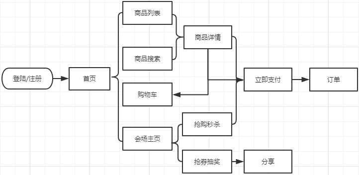 如下是一个典型的电商平台核心业务链路图,涉及到登录、首页、商品、购物车、支付、分享等模块。