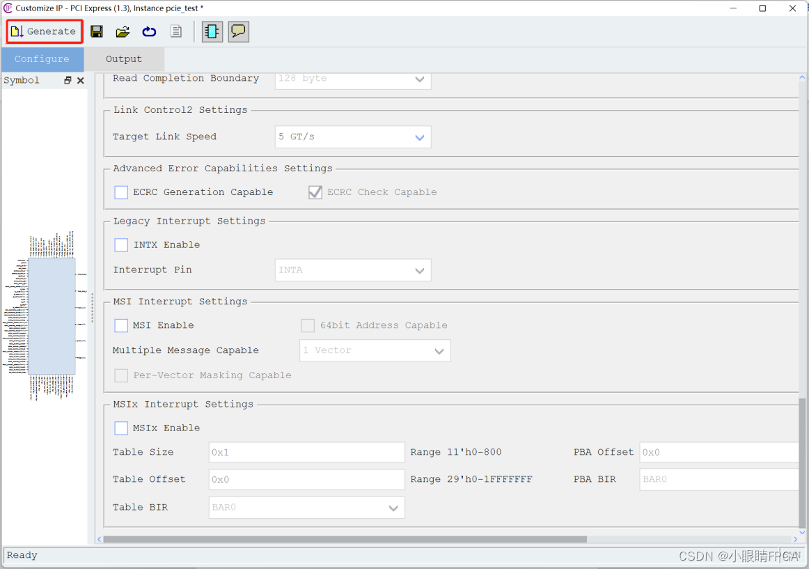 4. 其他设置可保持默认,点击 Generate 生成 PCIE IP;:
