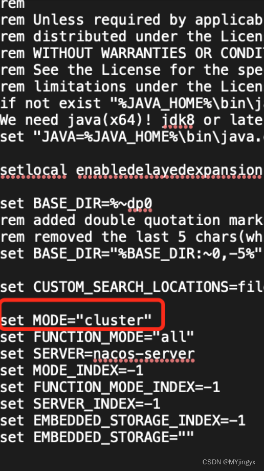 进入bin,启动文件默认配置为集群模式,需修改为startup.cmd中的配置,set MODE="standalone",单机模式