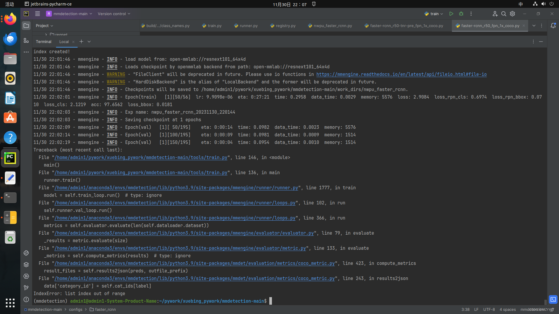 MMdetection3.0 报错data[‘category_id‘] = self.cat_ids[label] IndexError: list index out of range 1、按照网上各种修改意见修改了数据num_classes,也将原始文件的coco数据集下面的classes、pattle等参数作了修改,但是就是在其他模型可以,在faster-rcnn上面报如下图所是错误。问题:在使用MMdetection3.0 训练NWPU-VHR-10数据时,使用Yolov3模型可以正常训练测试,但是当使用Faster-rcnn模型训练的时候,一直如下图所示错误。2、数据集是将NWPU-VHR-10数据集转换成了coco数据集格式进行训练的。
