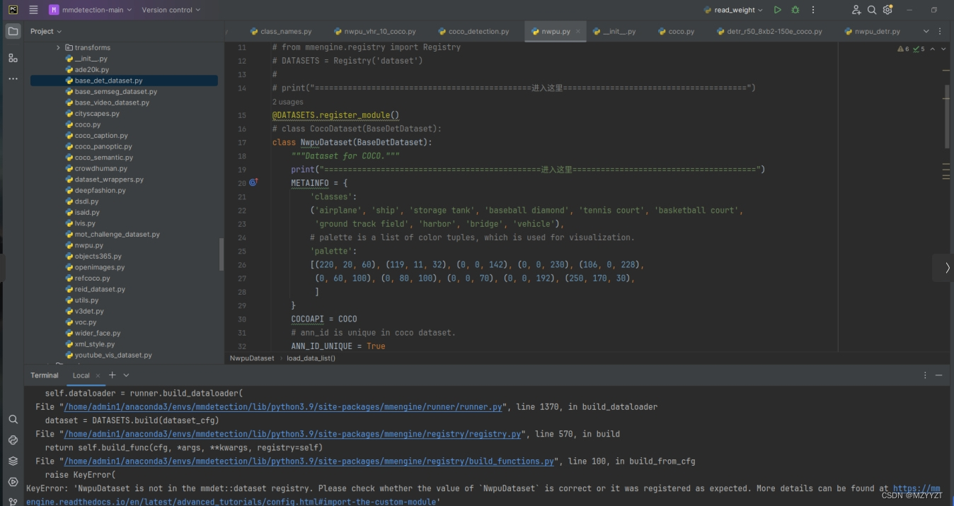 MMdetection3.0 自定义数据集报错 3、然后又使用了python setup.py install 进行了编译 还是无效。2、然后在mmdet/datasets/在进行自定数据集的时候报如上错误。.py进行了登记,但是就是无效。1、创建了自己的数据集。请各位大佬指点一下!
