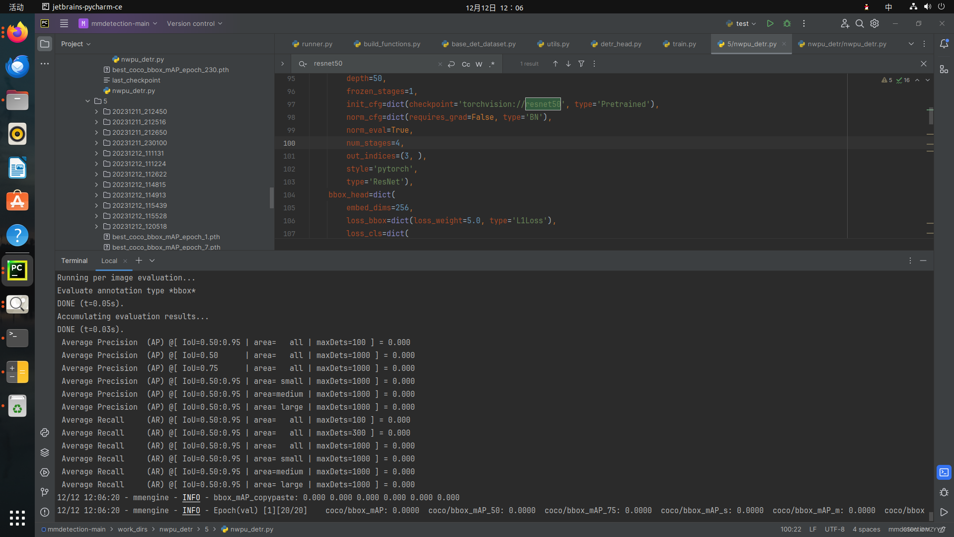 MMdetection3.0 问题:DETR验证集上AP值全为0.0000 2、在Faster-rcnn、YOLOv3模型上均能训练成功,但是在DETR训练时,出现验证指标全为0.0000的问题。1、选择的是NWPU-VHR-10数据集,其中训练集455张,验证、测试相同均为195张。是因为数据集量太小的原因吗?还是需要特别关注某些具体参数的调整呢?1、DETR验证集上AP值全为0.0000。请各位路过的大佬指教一下!