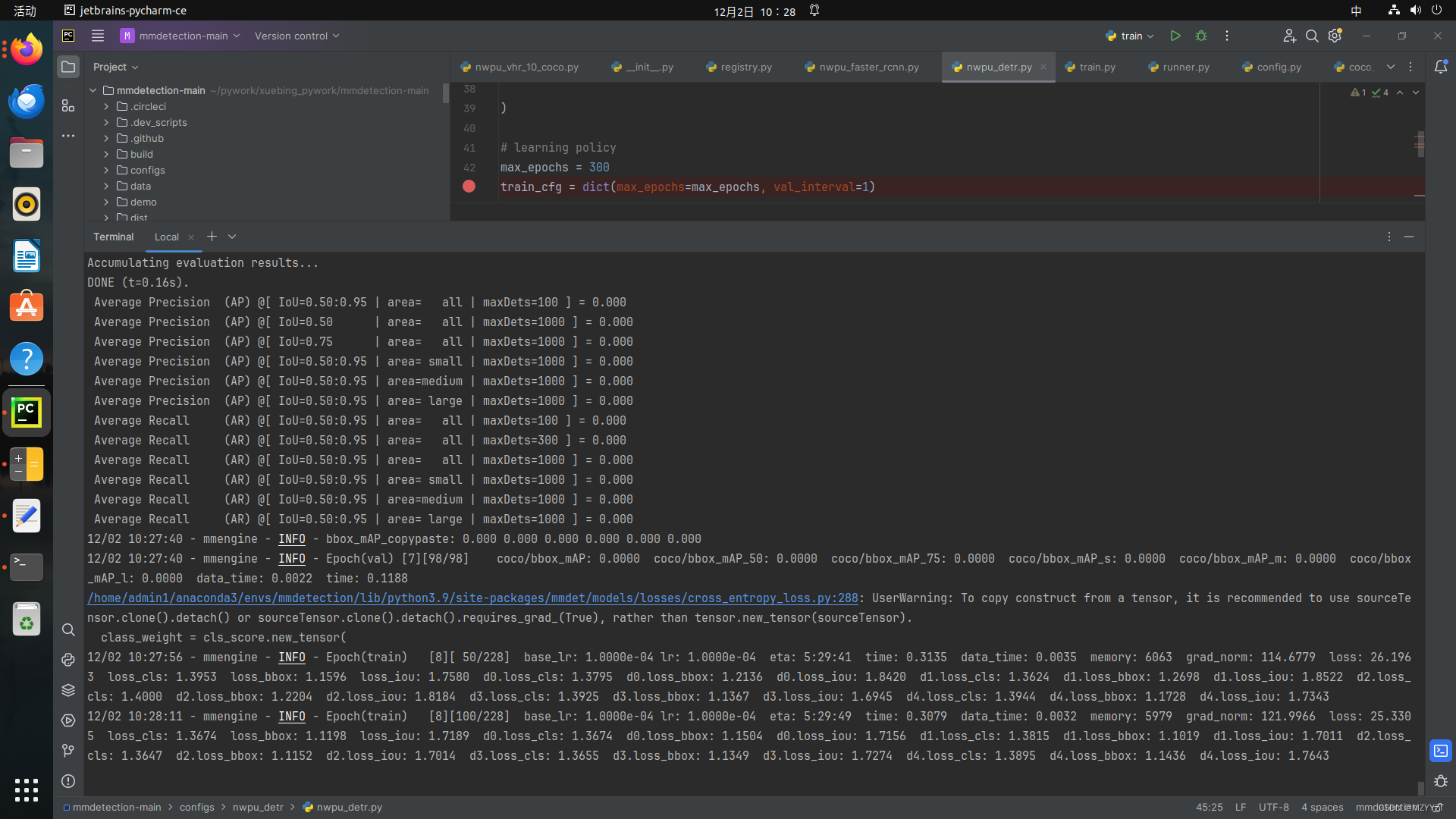 MMdetection3.0 debug 4、输出也是正常的。(6,2,100,11)中的6是DETR的解码器一共迭代了6次,每次输出的结果均做了保存,2是batch-size的值,100是DETR的num_ queries,11是本数据集类别数10 + 1(背景)2、数据没问题,代码输出没问题,loss没问题,那么为什么在训练过程中的val的map一直是0.0000呢?3、data_address好像是根据随机种子得出来的,有点多余感觉,可能暂时没有搞懂作者是什么意思吧。1、NWPU-VHR-10数据集,类别为10,训练455张,验证195张;