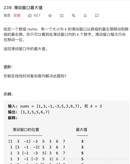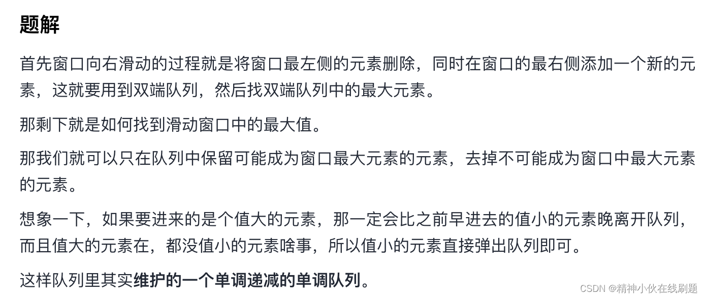 单调队列:队列的性质是先进先出,为什么滑动窗口的最大值这个题用单调递减队列?因为窗口往右边滑动的时候,队列前端的值不在窗口里了,把队列前端的值弹出。右侧的大值,一定可以屏蔽左侧的小值。